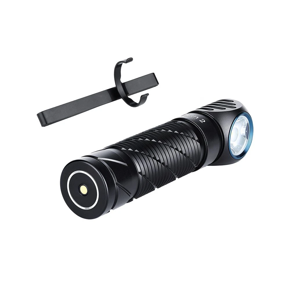 The Olight Perun 2 is a rechargeable right angle flashlight/headlamp that runs on an included 4000mAh 21700 battery with a maximum output of 2,500 lumens. It features a distance sensor for safety, a removable bi-directional pocket clip and a magnetic tail. It can also be used as a headlamp with the included headband.