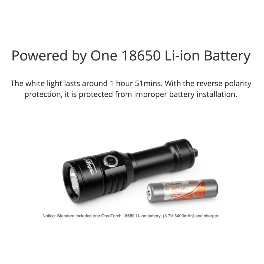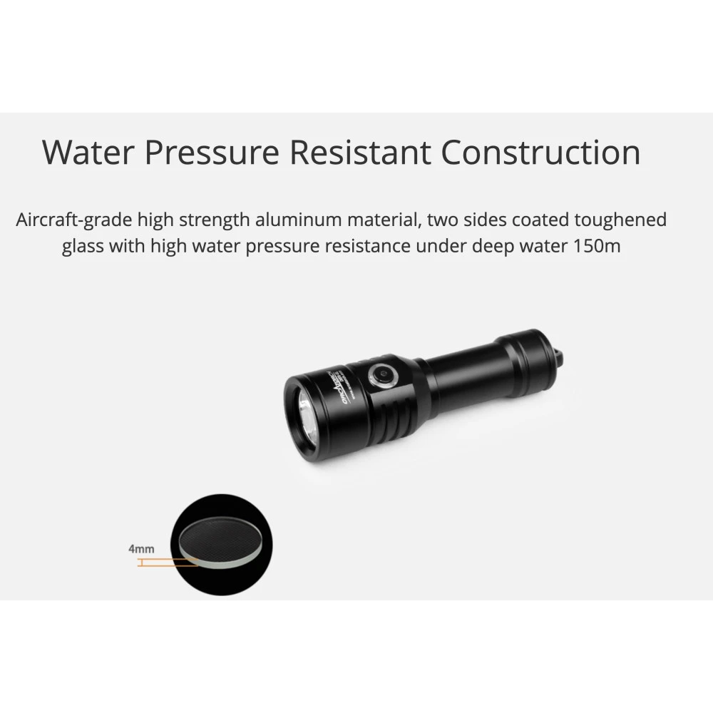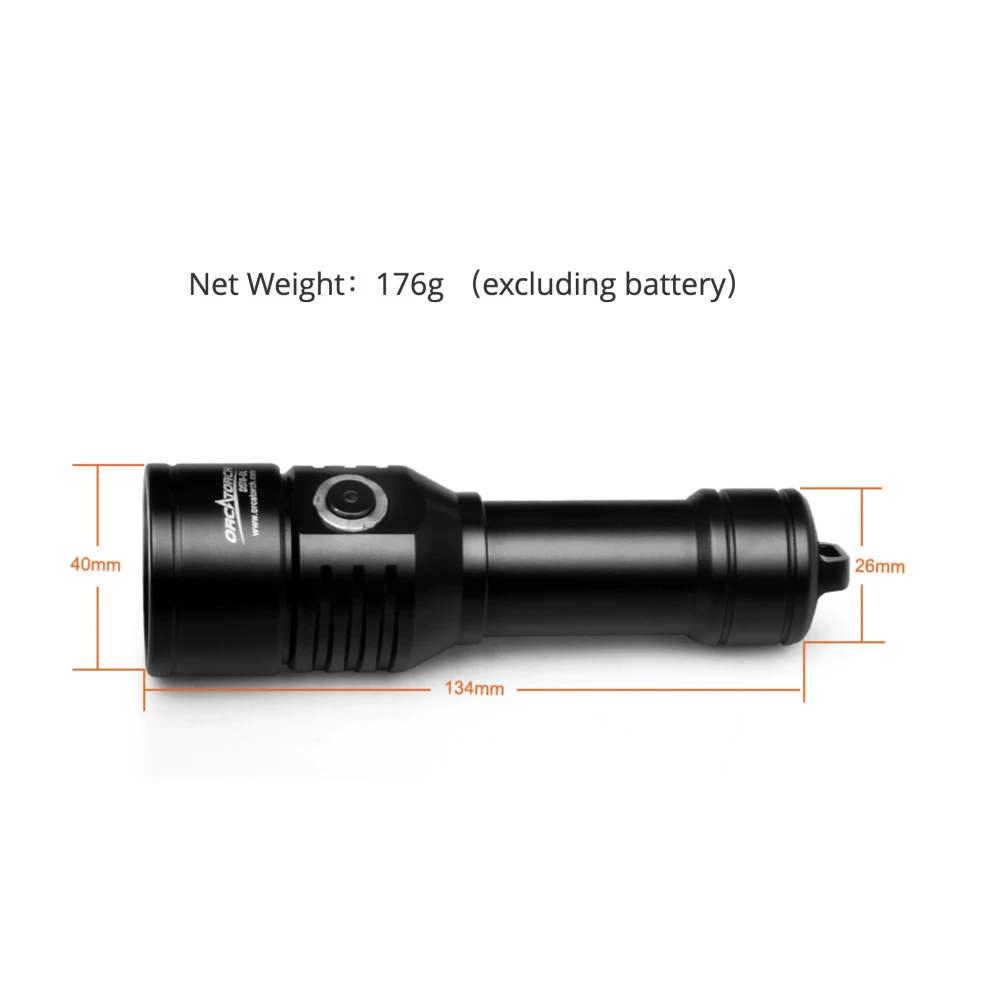Waterproof to a depth of 150 metres, the OrcaTorch D570GL dive light can produce both white light and green laser light beam. The white light powered by a LUMINUS LED is capable of producing up to 1000 lumens of output and distance of up to 281 metres; and 1x auxiliary green beam laser light. The two light sources makes it ideal for various underwater activities, including cave dives, recreational dives, underwater photography, spearfishing, and backup lighting. The light is designed for easy use, with side button switch operation. Additionally, the light is durable, constructed of high-strength A6061-T6 hard-anodised aluminium. D570-GL is supplied with 1x 18650 3400mAh battery with integrated micro-USB charging port.