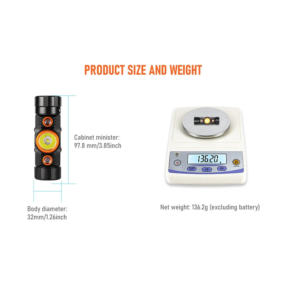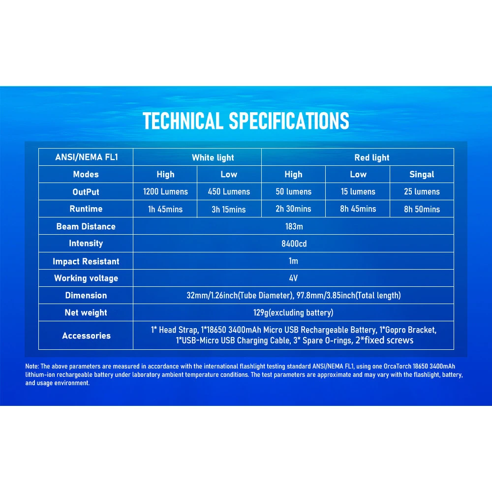 - White Light 1200 (1hr 45 mins) and 450 Lumens (3hrs 15mins)