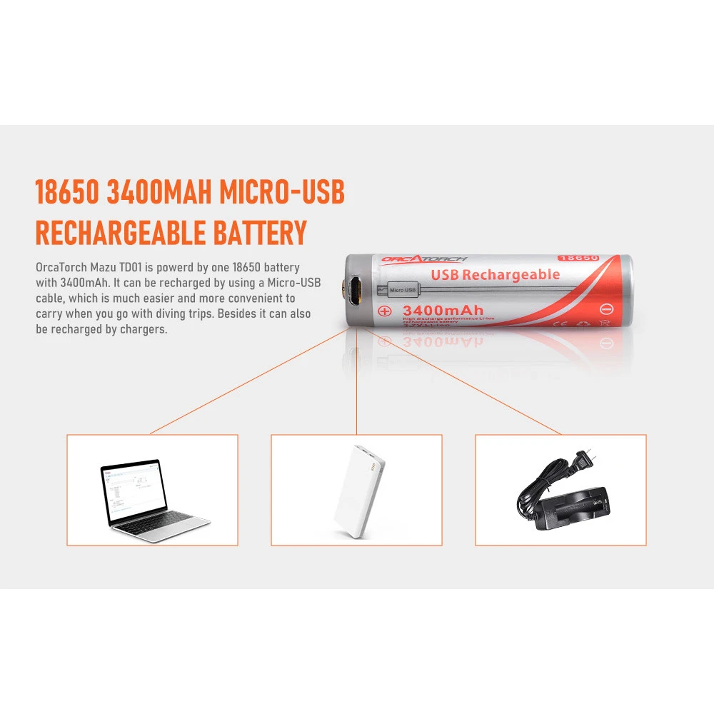 - Comes with an 18650 3400mAh Micro-USB chargeable battery