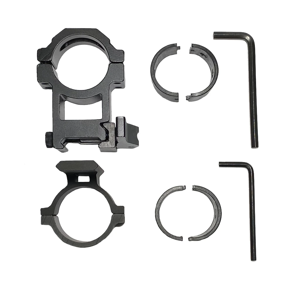 Each kit comprises of the following components to all for mounting on a scope with a 25mm round or 30mm round and also with flashlights with an outer body diameter of 25mm or 30mm.