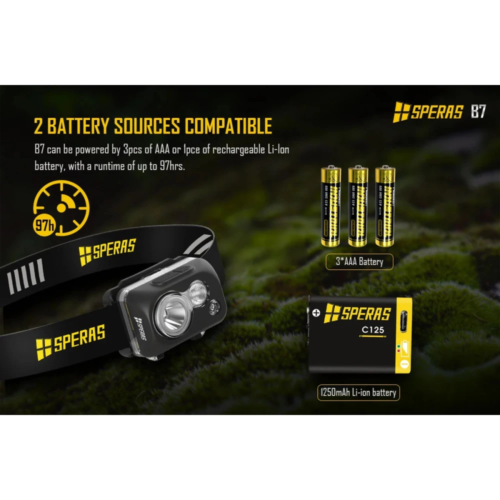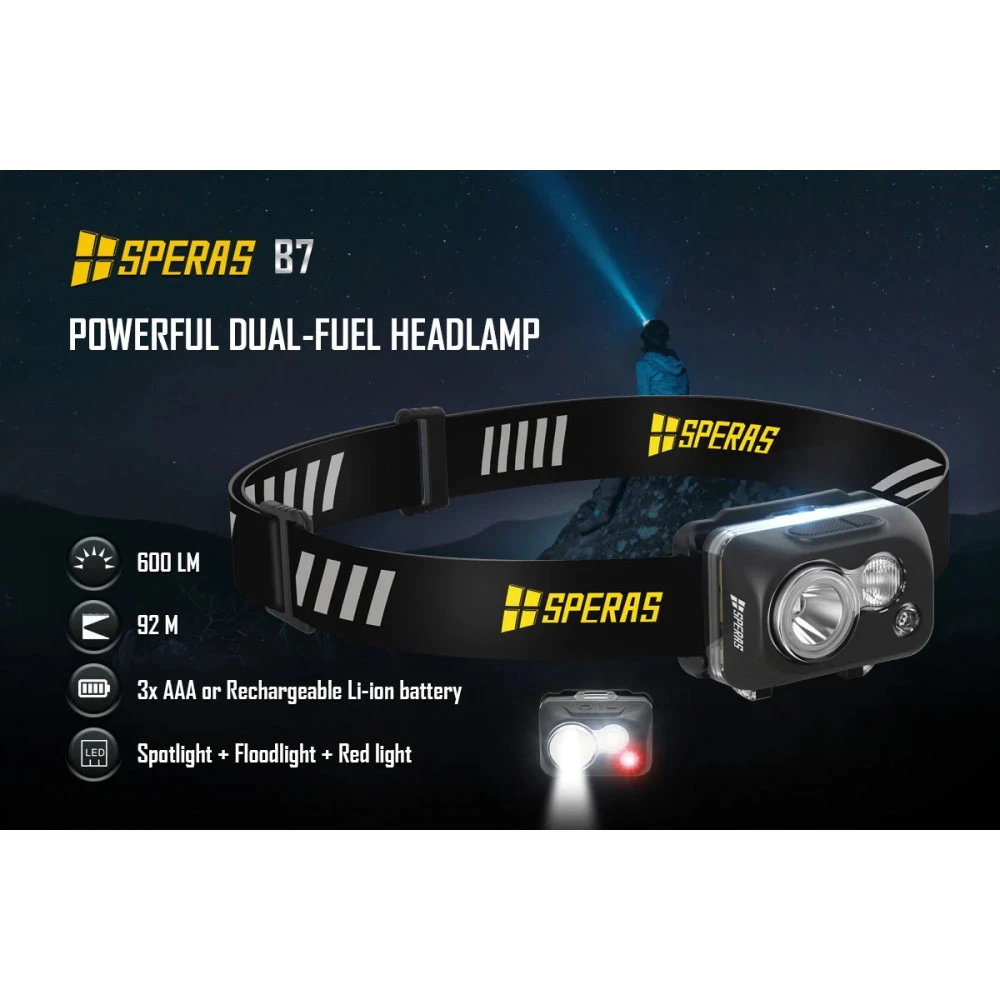 SPERAS B7 Lightweight Dual-Fuel Headlamp With Red Light (600 Lumens, 92 Metres)