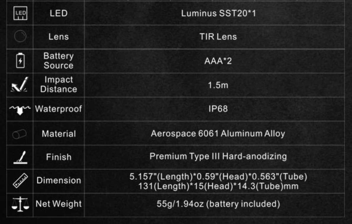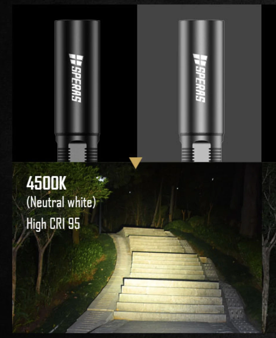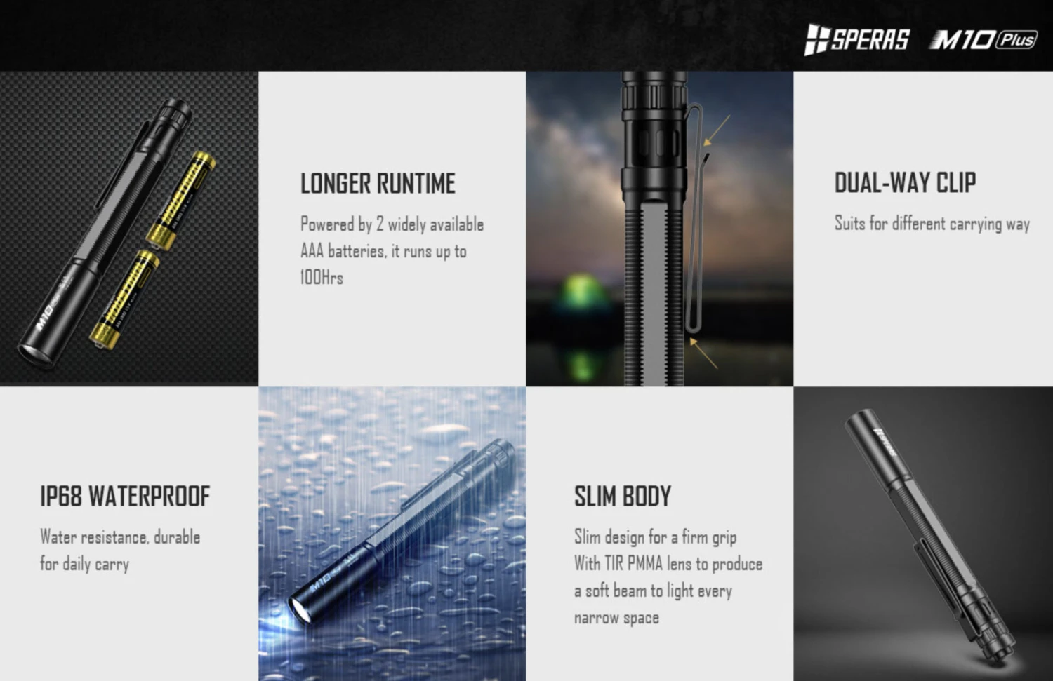 The 2x AAA battery operated SPERAS M10 Plus penlight is a slim, lightweight and has a metal tail-switch. Its high-performance LED, paired with a PMMA TIR optic lens, produces a soft and balanced beam with a max 200 lumen setting, and a runtime reaching up to 100 hours at Low mode. The slim and lightweight design is perfect for handheld use with its non-slip knurling. It also features a two-way pocket clip that can easily clip onto a pocket or backpack strap.
