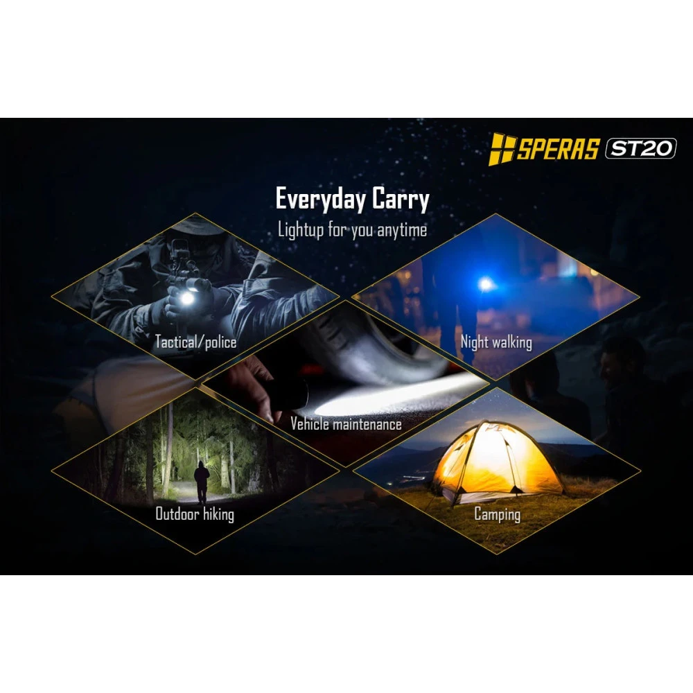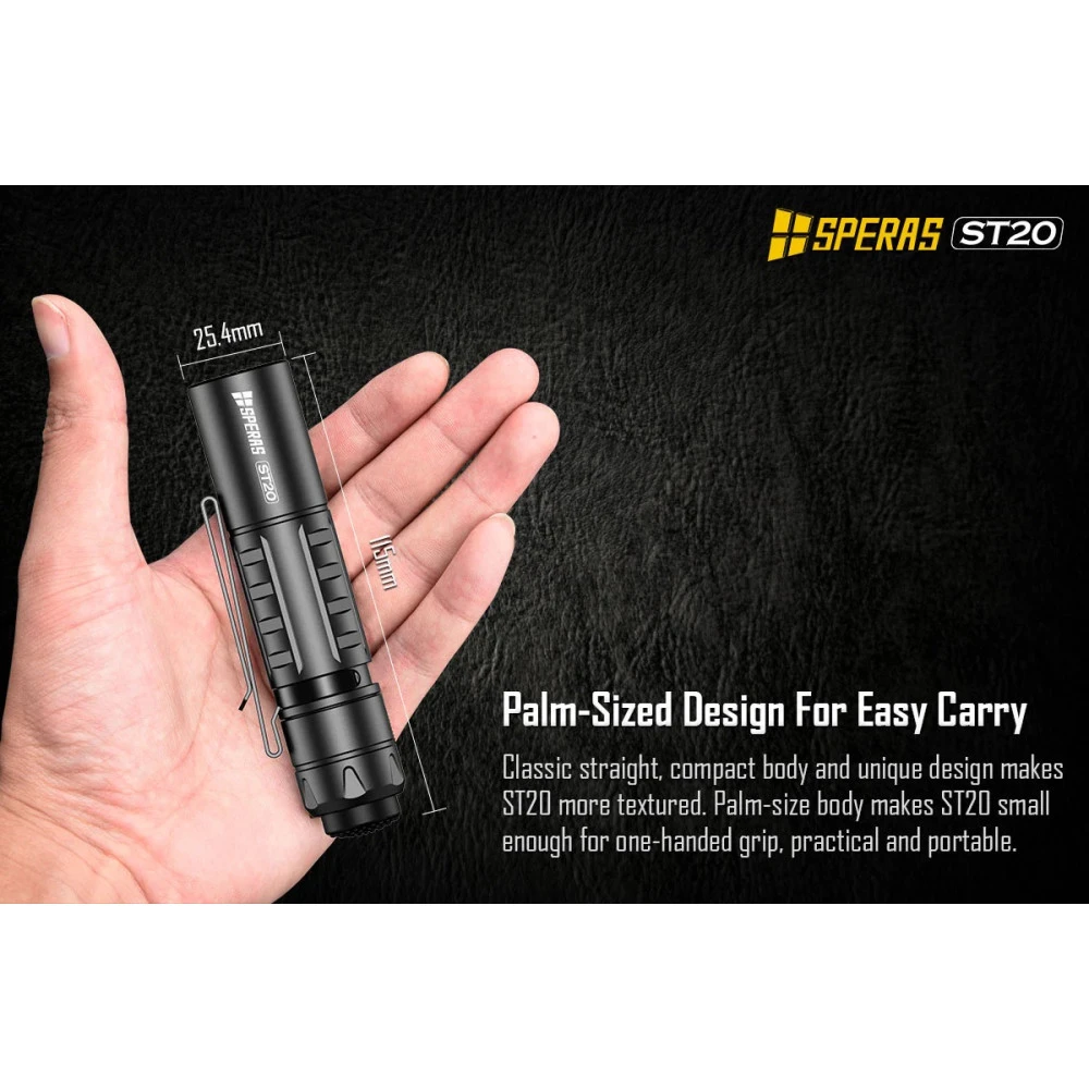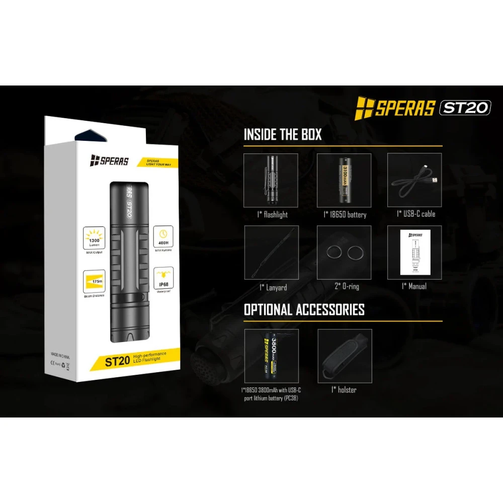 - The ST20 (A) is equipped with SPERAS EB31 battery(18650 3100mAh); Battery charger is not included