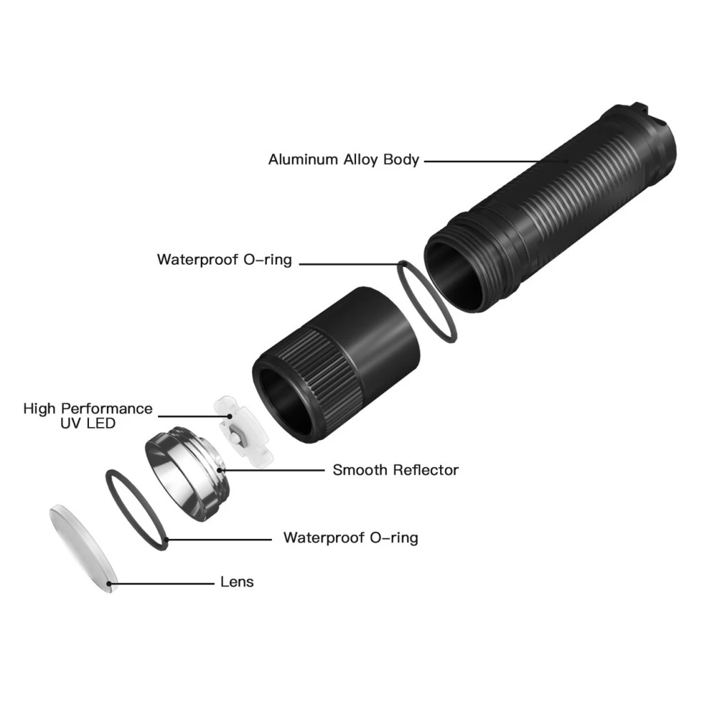 - Mini size, and Lightweight – The 75mm long UV flashlight can easily be carried in a pocket due to its small size, and only weighs 41g.