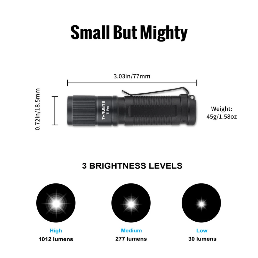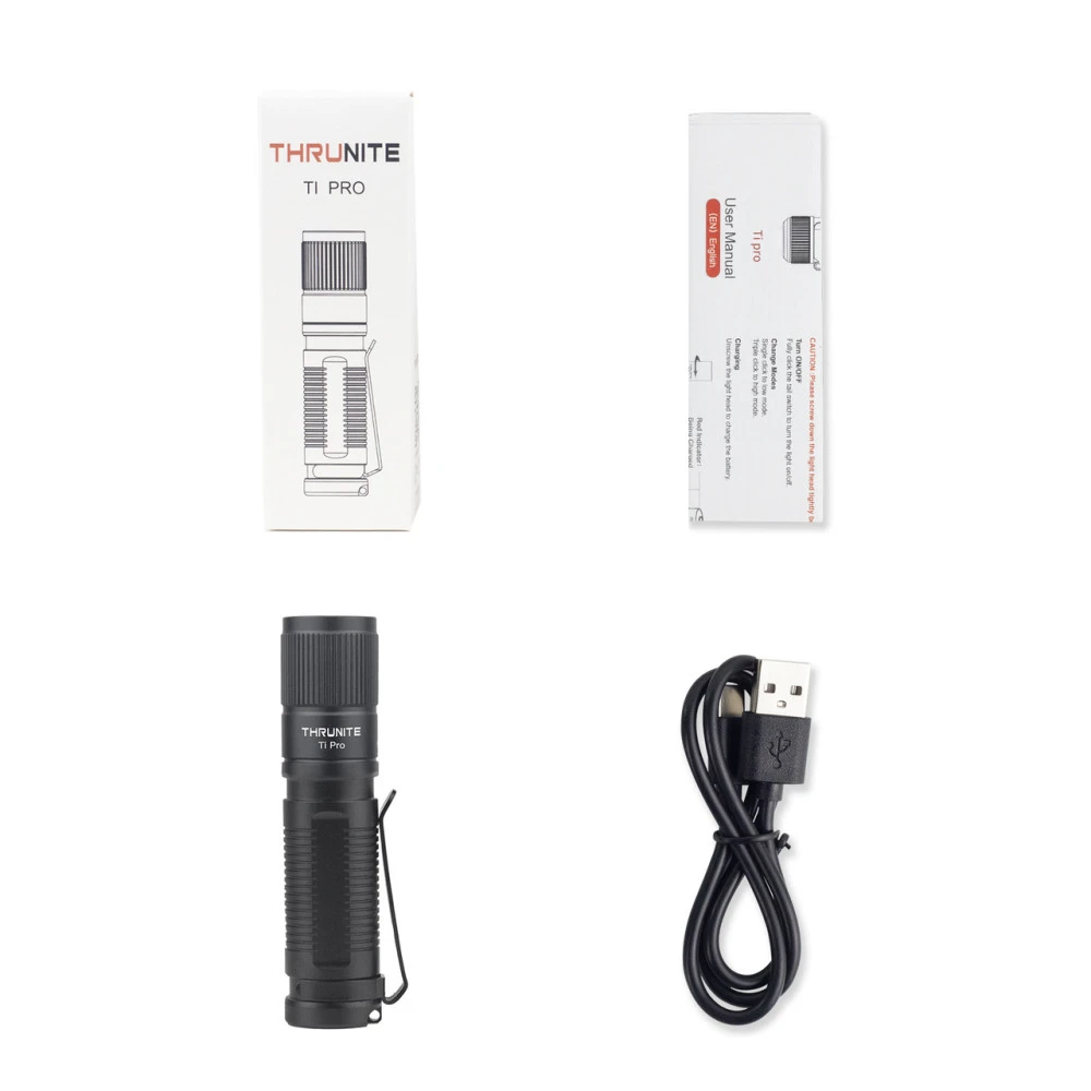Package includes: ThruNite Ti Pro LED Flashlight, 1 x Li-ion 14500 Battery, USB-C Charging Cable, Pocket Clip, User Manual