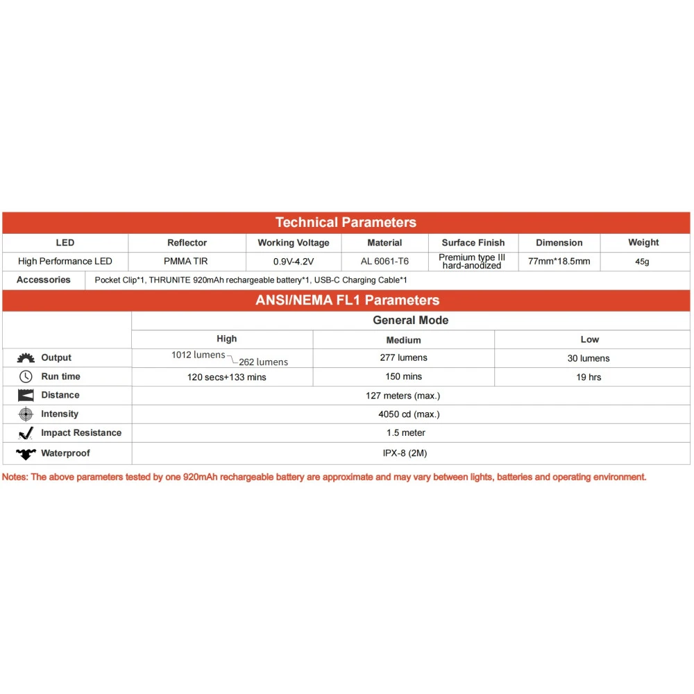 Note: High mode is measured in total runtime – this includes step-down outputs. Output information was tested using the included Li-ion 14500 battery; Using AA batteries may result in differing performance.
