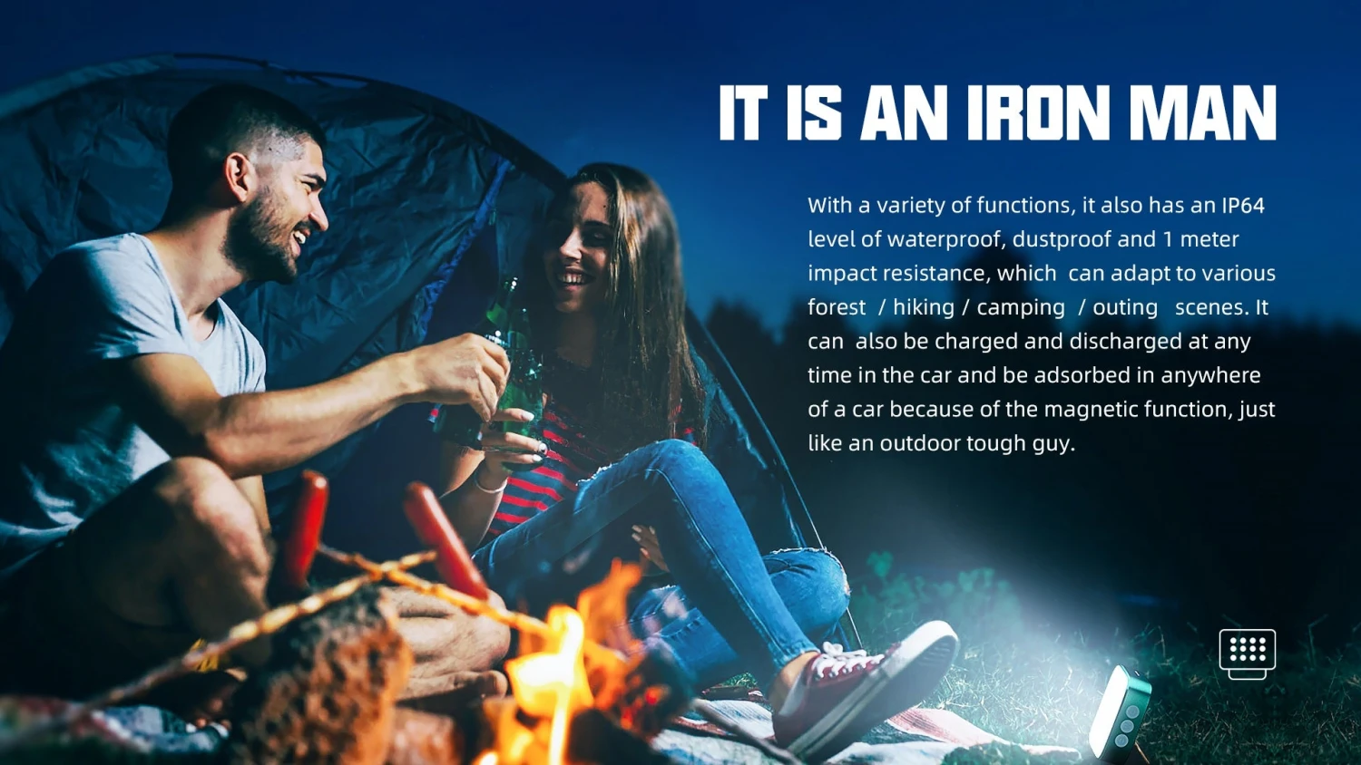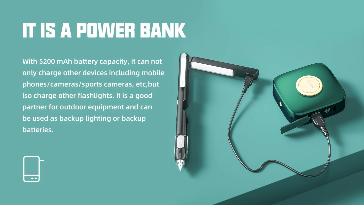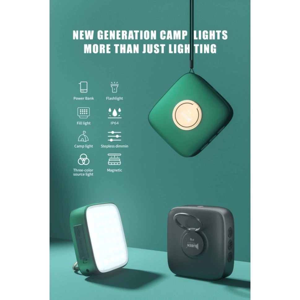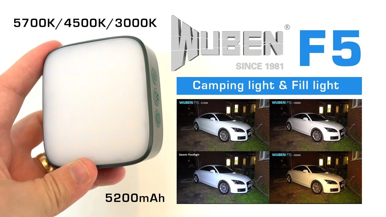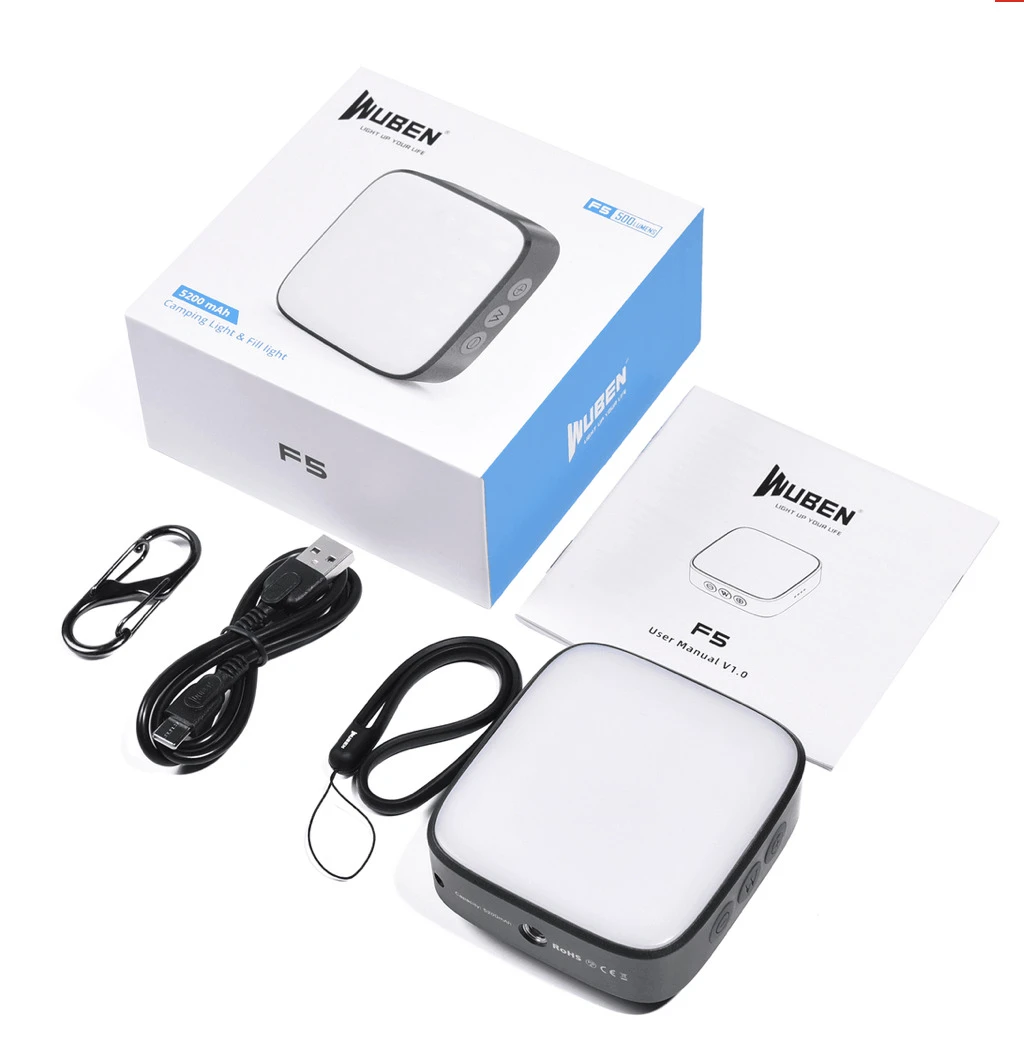 Wuben F5 is a camping light with multiple colour temperatures (5700K. 4500K. 3000K), and a power bank function. It can be used as a camping lantern / flashlight / emergency light /photography fill light, under different modes from high bright to low bright. It can be used as a power bank with one USB output port to charge your smartphone or mobile devices in emergency, or recharge the item with another power supply with input port. It provides over-charge protection, over-discharge protection and short-circuit protection for longer and safer use. It has 2 pieces built-in 18650 Li-ion batteries of 5200 mAh and Type-C fast charging, and emits 500 lumens max output. It is also IP64 Water Resistant. It’s equipped with a ring holder, strong magnet, and a tripod hole for different applications. When the light is off, triple click on “W”switch to turn on/off the blue breathing light. It is easy to find the camping light in darkness with the breathing light on. When the light is off, open the rubber cover, connect the light to any 5V/2A charging device with Type-C in charging cable to charge it, it takes about 4 hours to be fully charged. Connect the charging cable to the USB-A OUT dis-charging port to charge any devices which can be charged via 5V/2A adapters.