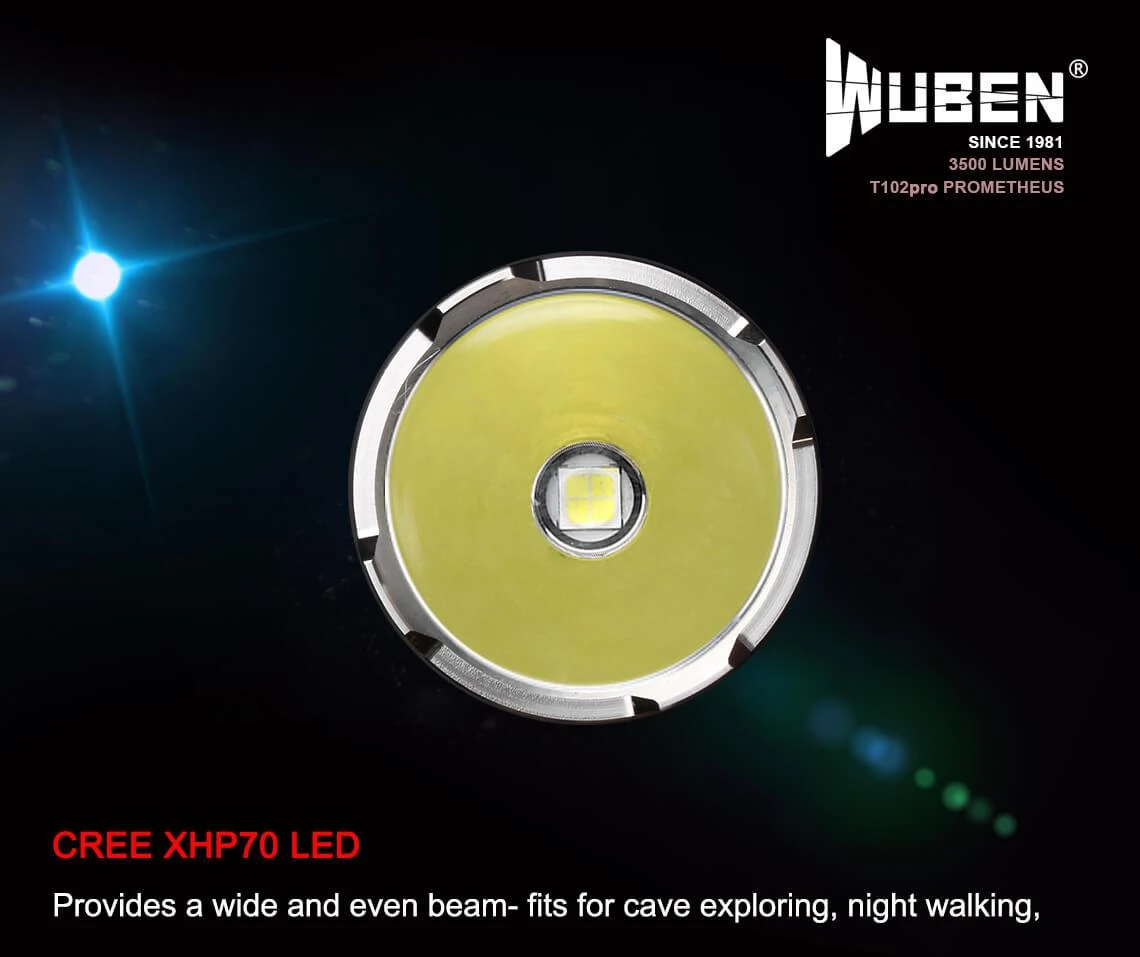 - High Output and Long Beam Distance: WUBEN T102 Pro Flashlight utilises 1x CREE XHP70.2 LED, the max output is up to 3500 lumens and the max beam distance is up to 500 metres (1640ft), specially designed for searching, rescuing or outdoors adventuring.