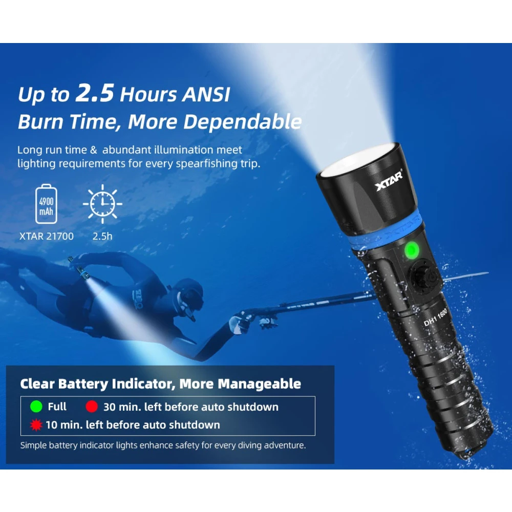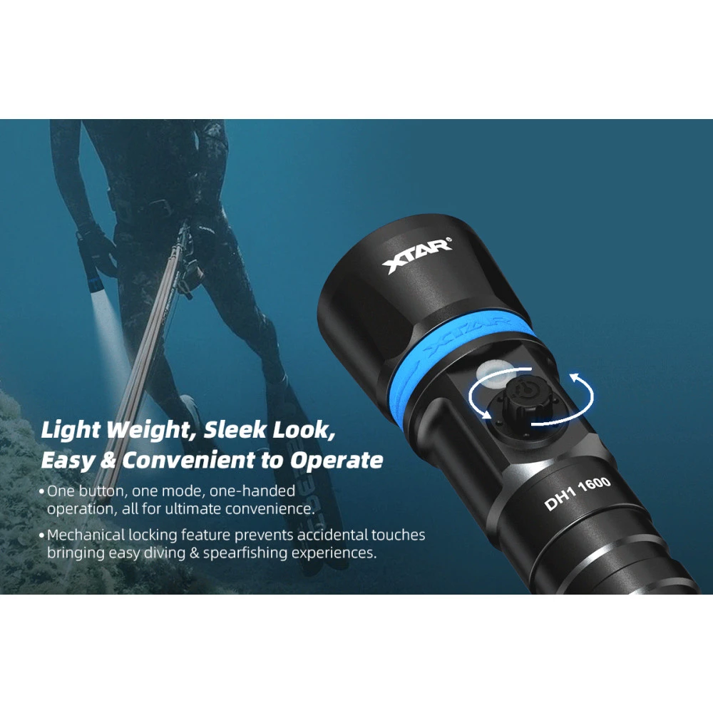 The XTAR DH1 1600 dive torch offers an impressive 1600 lumens of high brightness up to a depth of 100 metres. Whether diving into dark caves, or venturing into murky waters, the DH1 provides enhanced visibility even in challenging conditions.