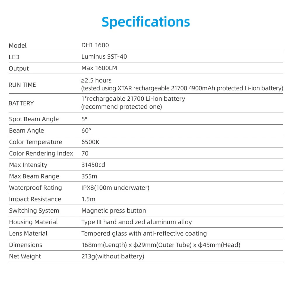 Powered by a 21700 battery (included), DH1 1600 provides generous runtimes of up to 2.5 hours, ensuring diving adventures are never cut short.