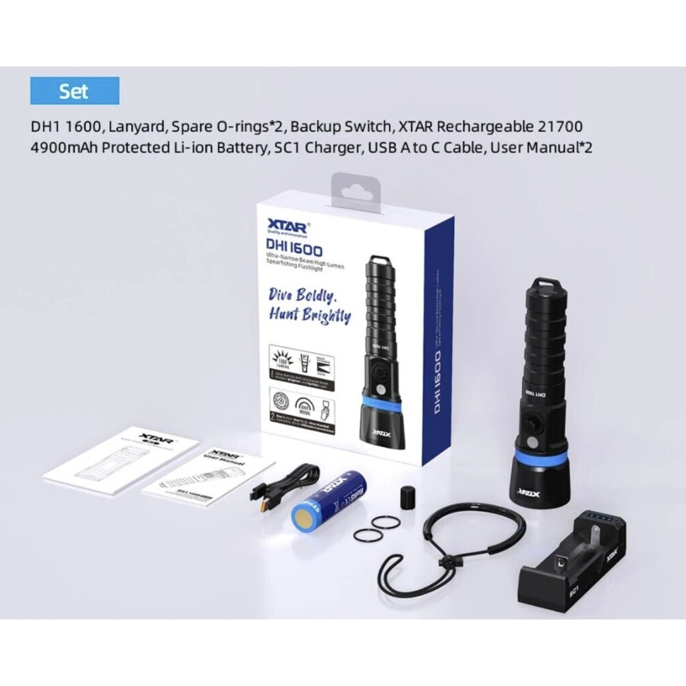Package Contents: DH1 Dive Torch, XTAR Rechargeable 21700 4900mAh Protected Li-ion Battery, SC1 Charger, USB-A to USB-C Cable, Lanyard, Spare Switch, 2x Spare O-Rings, User Manual